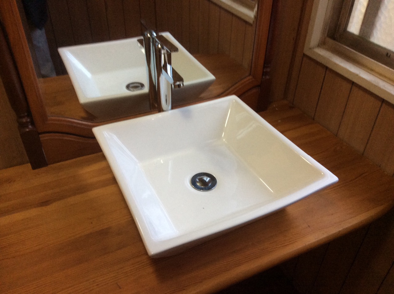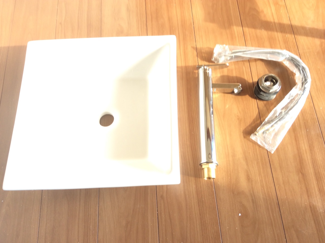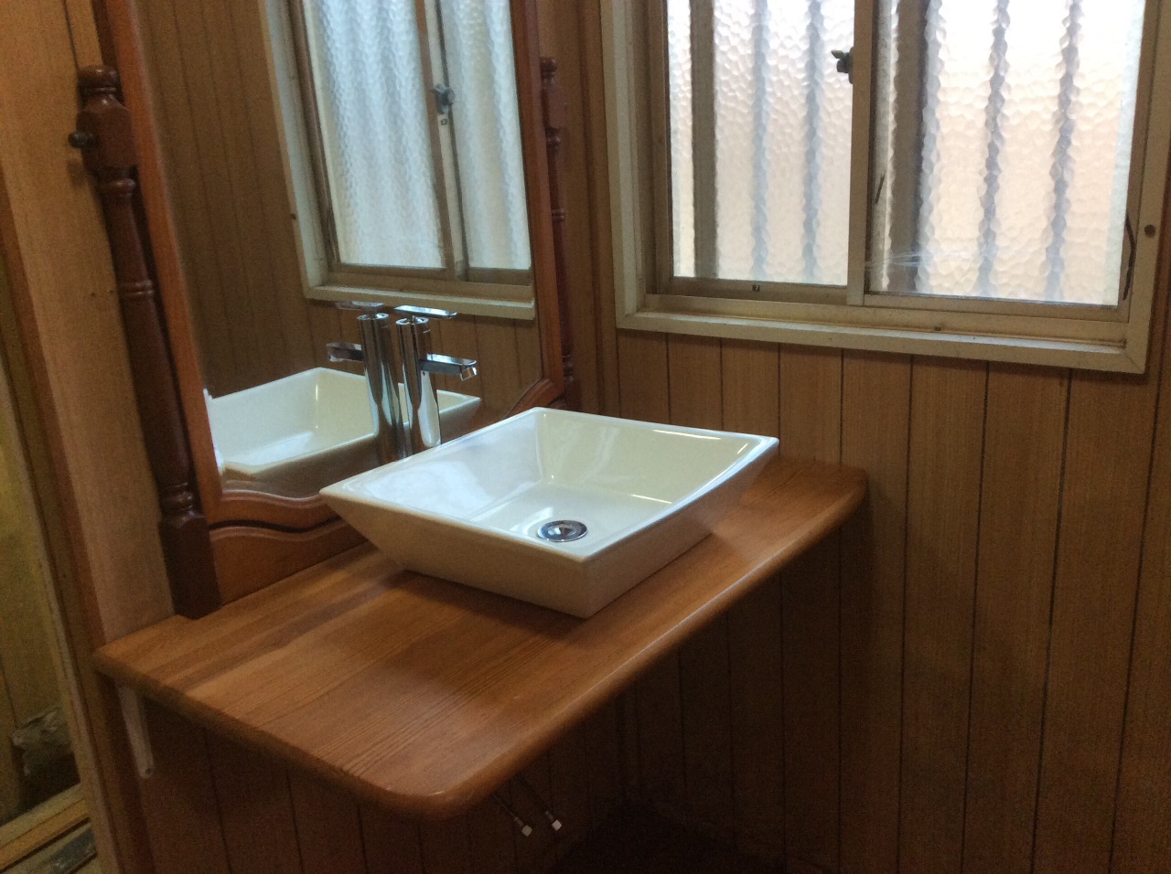 今回は洗面台に今流行りの洗面ボウルに混合水栓を付けて、鏡の部分はドレッサーの上の部分を